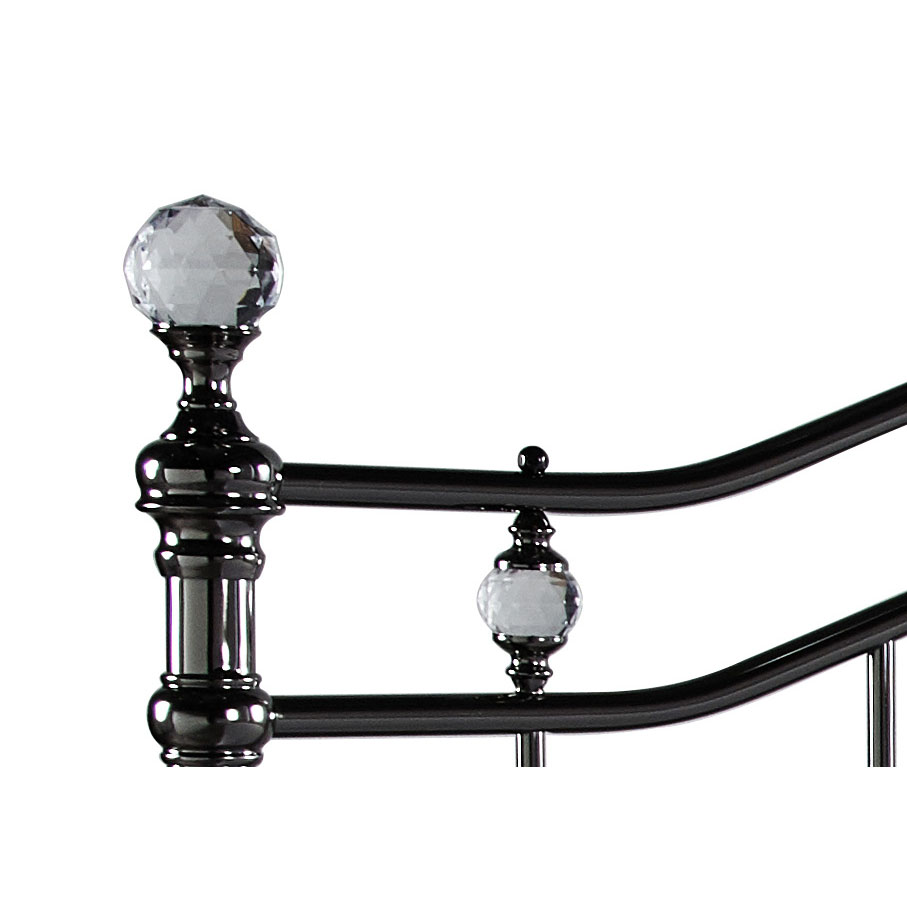 Crafted using hollow tube metal construction, the Cambridge headboard offers durability with balanced weight handling. The frame is finished in polished black nickel, providing a smooth, reflective surface that complements the crystal accents and decorative finials.